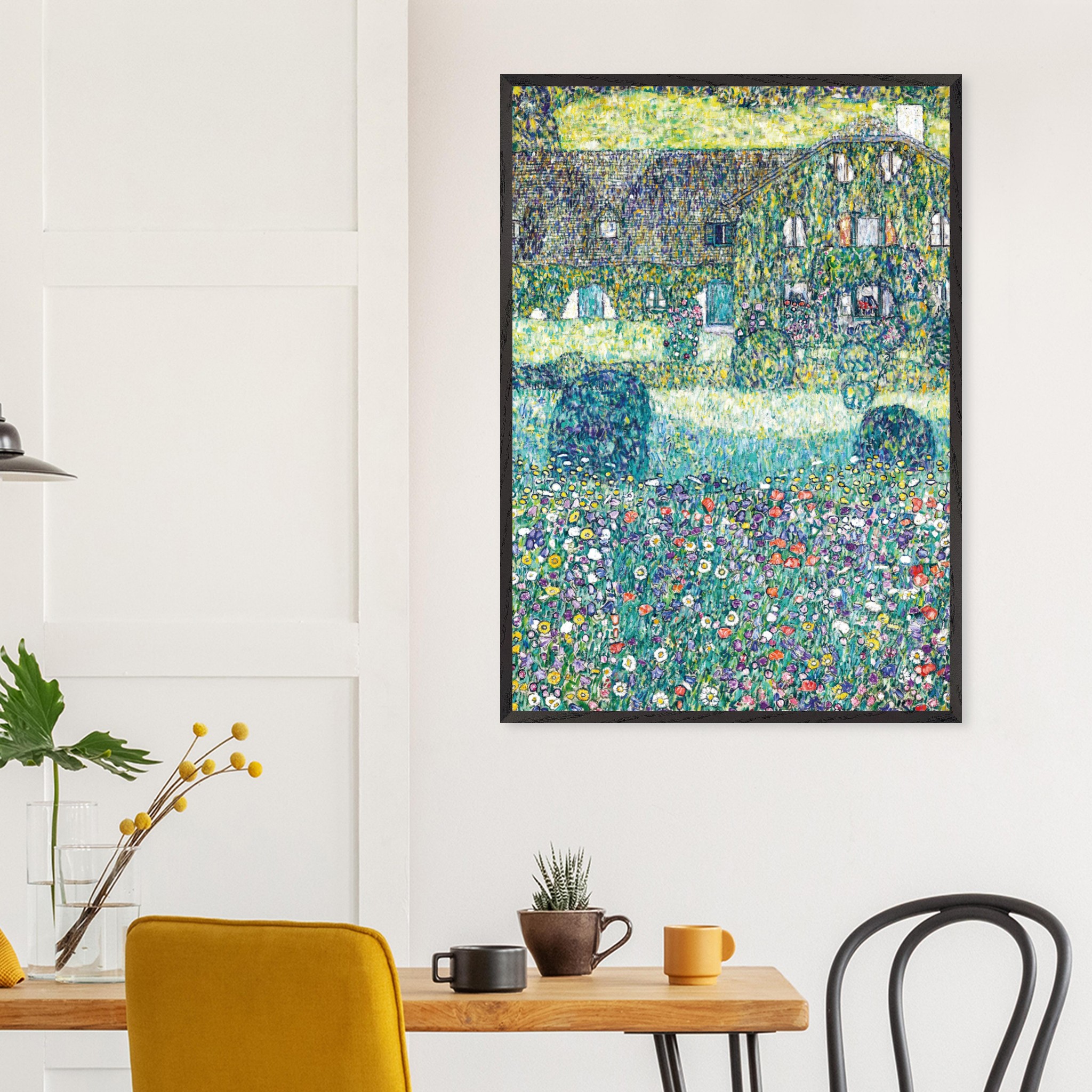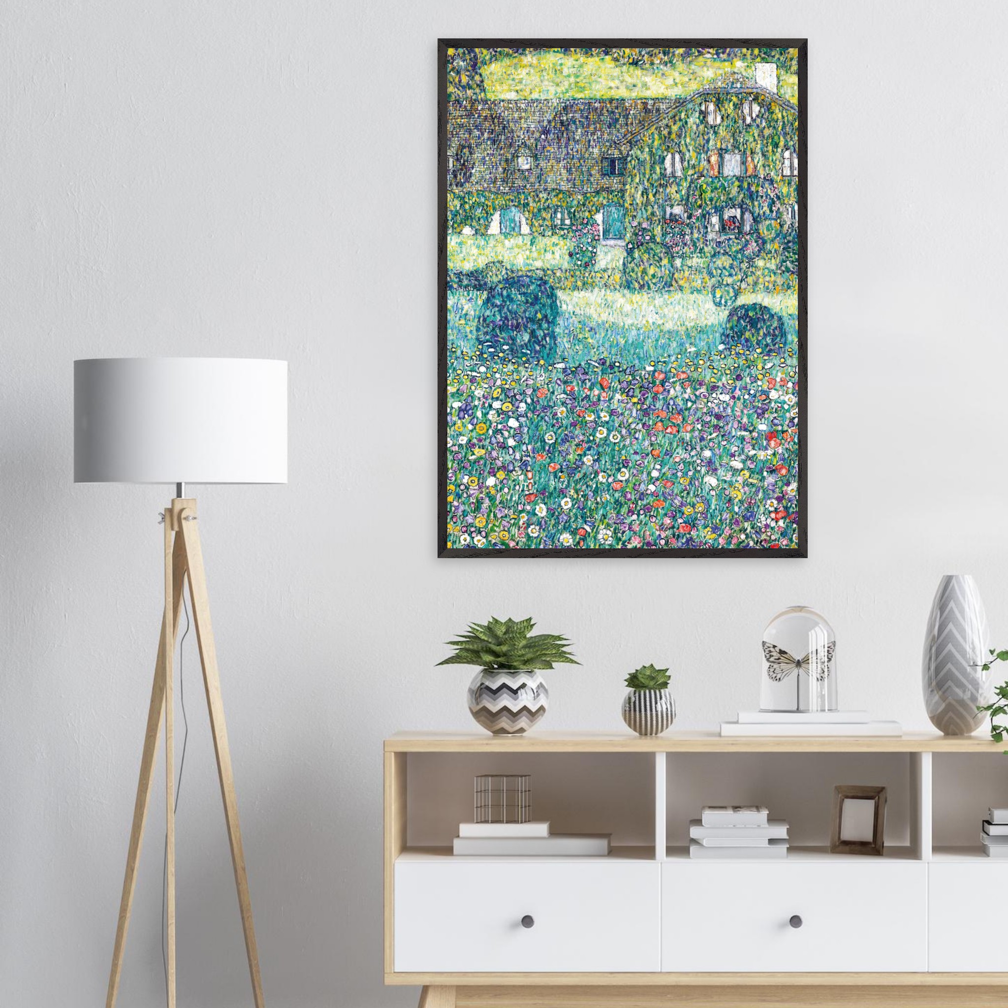 Country House by the Attersee (1914) toont een huis aan de oever van het Oostenrijkse meer, omringd door bomen, bloemen en weelderig groen. Gustav Klimt schilderde dit tafereel tijdens een van zijn zomers aan de Attersee. De compositie legt de nadruk op kleur, textuur en gelaagdheid – zonder menselijke aanwezigheid, maar vol leven. De poster vangt deze sfeer op treffende wijze en past in allerlei interieurstijlen waar natuurlijk licht en rust belangrijk zijn. Denk aan landelijke woonkamers, vakantiehuizen of hotels met een klassieke touch. Deze reproductie is decoratief en sfeervol en biedt een herkenbare esthetiek voor klanten die houden van landschappelijke kunst met een persoonlijke noot. Ook beschikbaar met een zwarte houten lijst!
