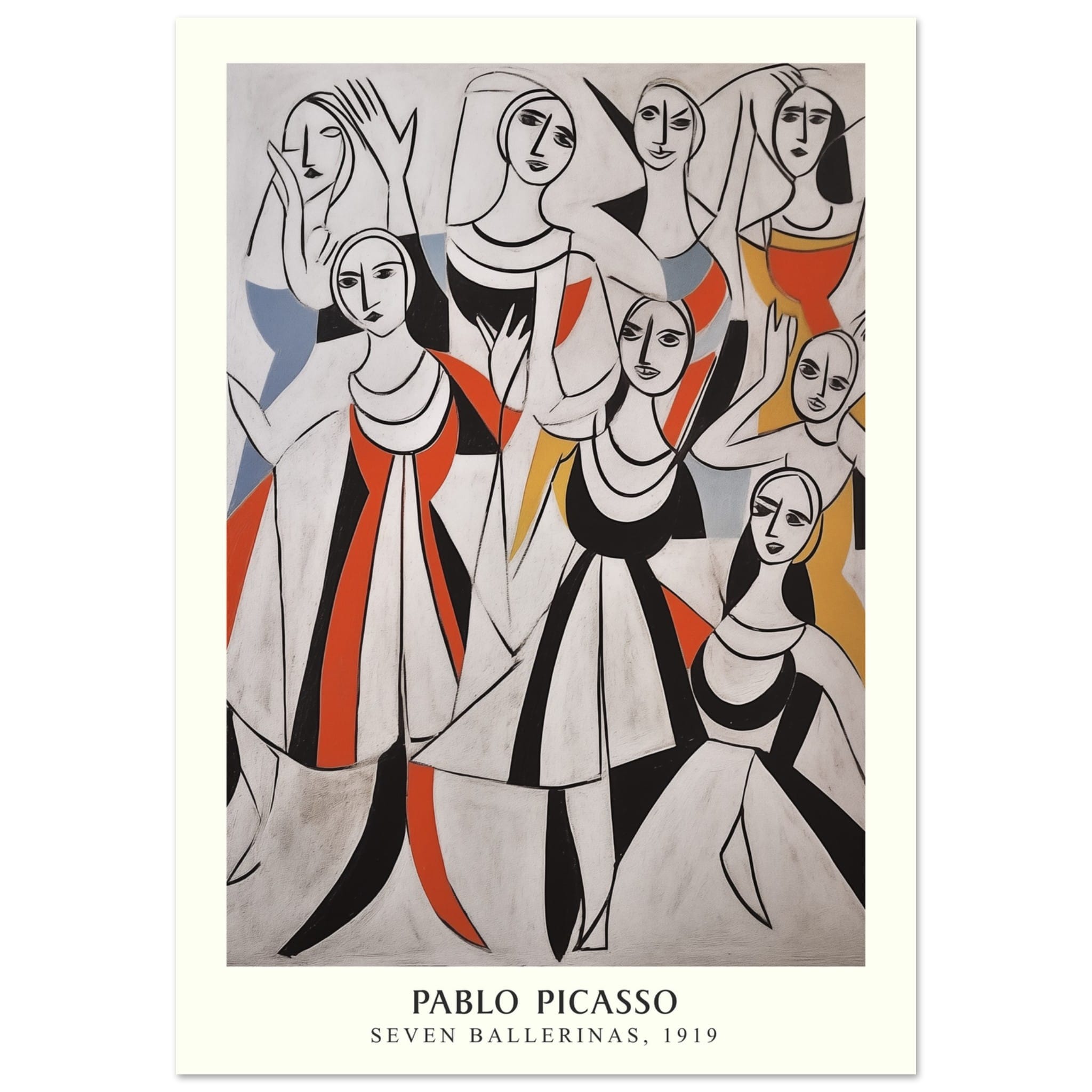 De Seven ballerinas poster brengt een speelse en abstracte ode aan de danswereld in de stijl van Pablo Picasso.