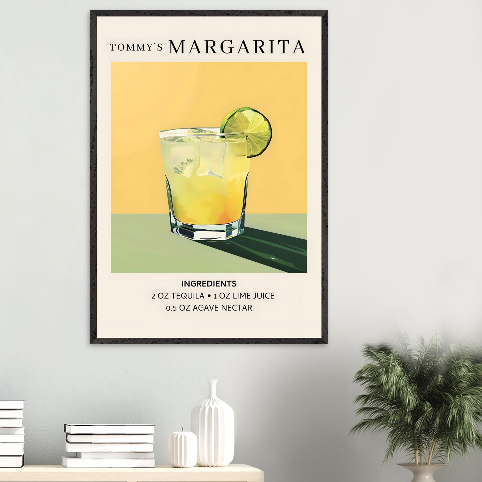 Ingrediëntenposter van Tommy’s Margarita met agavesiroop, een moderne twist op de klassieke cocktailfavoriet.