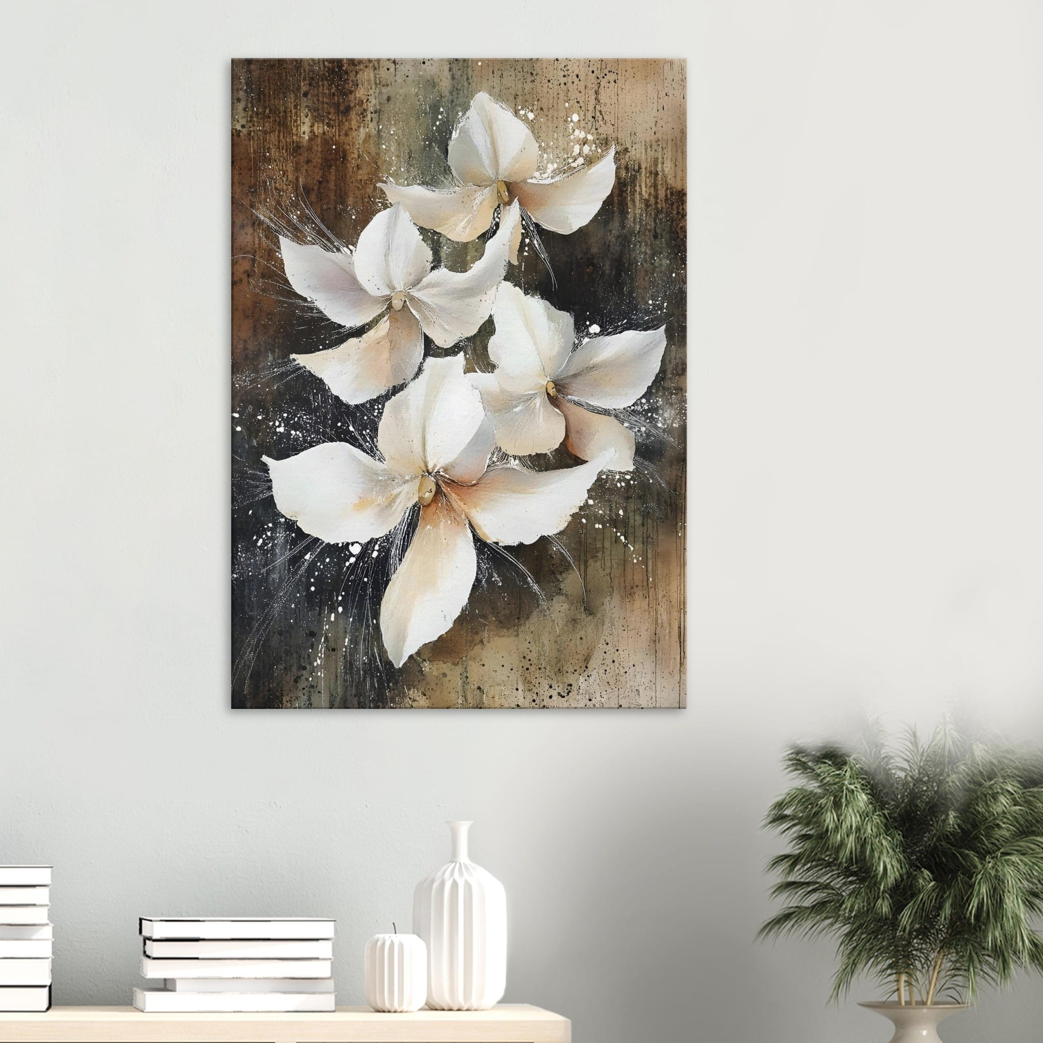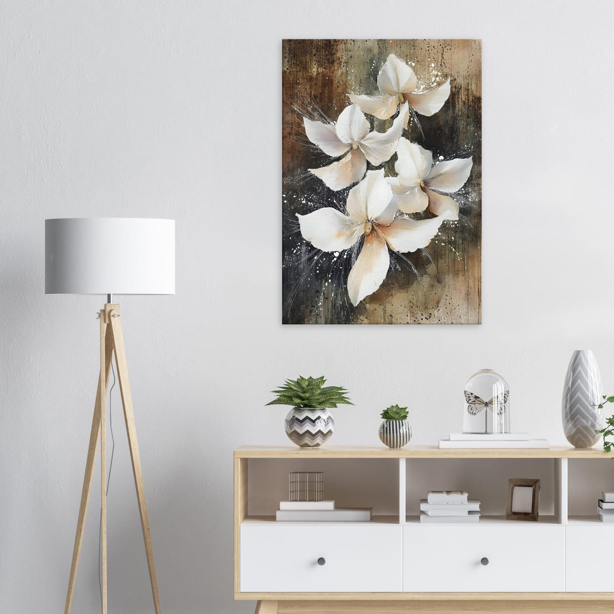 De Vintage white blossoms canvas print toont witte bloemen op een warme, verweerde achtergrond. Deze wanddecoratie brengt een zachte en rustieke uitstraling in het interieur.